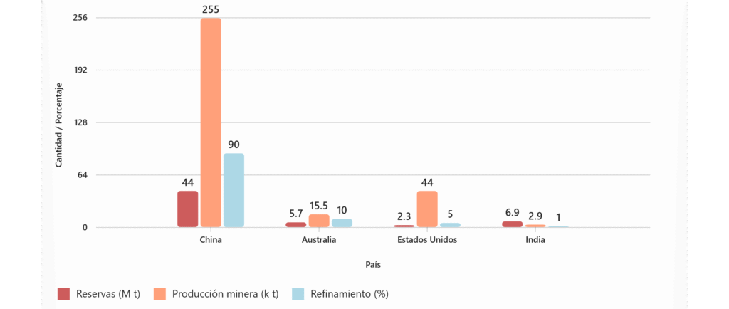 - China, al controlar la mayoría del refinamiento, tiene una ventaja estratégica crítica — lo que implica que aunque otros países tengan reservas, la dependencia de China persiste a menos que desarrollen toda la cadena.